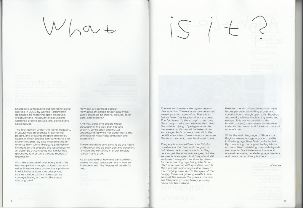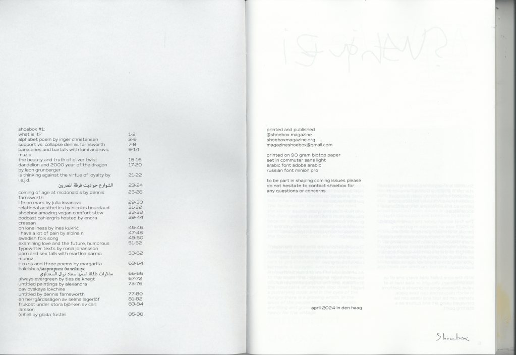 The first edition of Shoebox Magazine has been published. It is available in limited copies by reaching out either by email or via Instagram for 15 euros. This money will go to paying for printing costs and also for future editions of Shoebox.